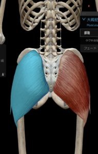 大殿筋は骨盤・仙骨から太ももの外側についている非常に大きい筋肉です。日頃は股関節を後ろに動かしたり、外側にひねってくれたりしています。