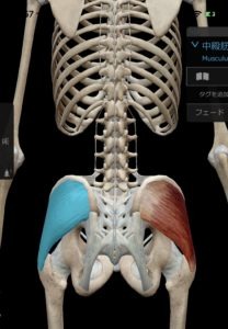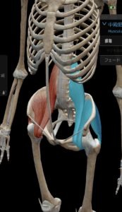 中殿筋は骨盤から太ももの外側の大転子という部分に付着しています。日頃は股関節を外側に広げてくれたり、歩行中などの骨盤の安定に働いています。